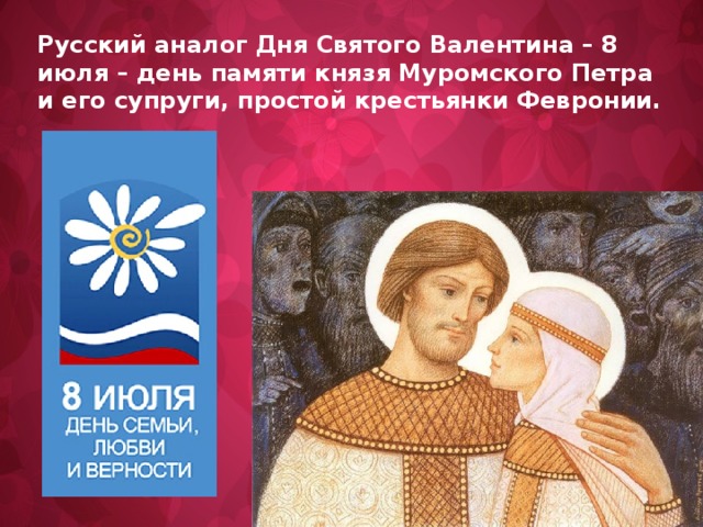 Придерживаясь дней памяти святых, записанных в церковном календаре, православные не празднуют день святого Валентина. У них есть свои традиции, которые направлены на поддержание благопристойного поведения и повышения семейных ценностей. Выдуманная легенда является лишь ширмой, за которой происходят бесчинства, считают православные священники.