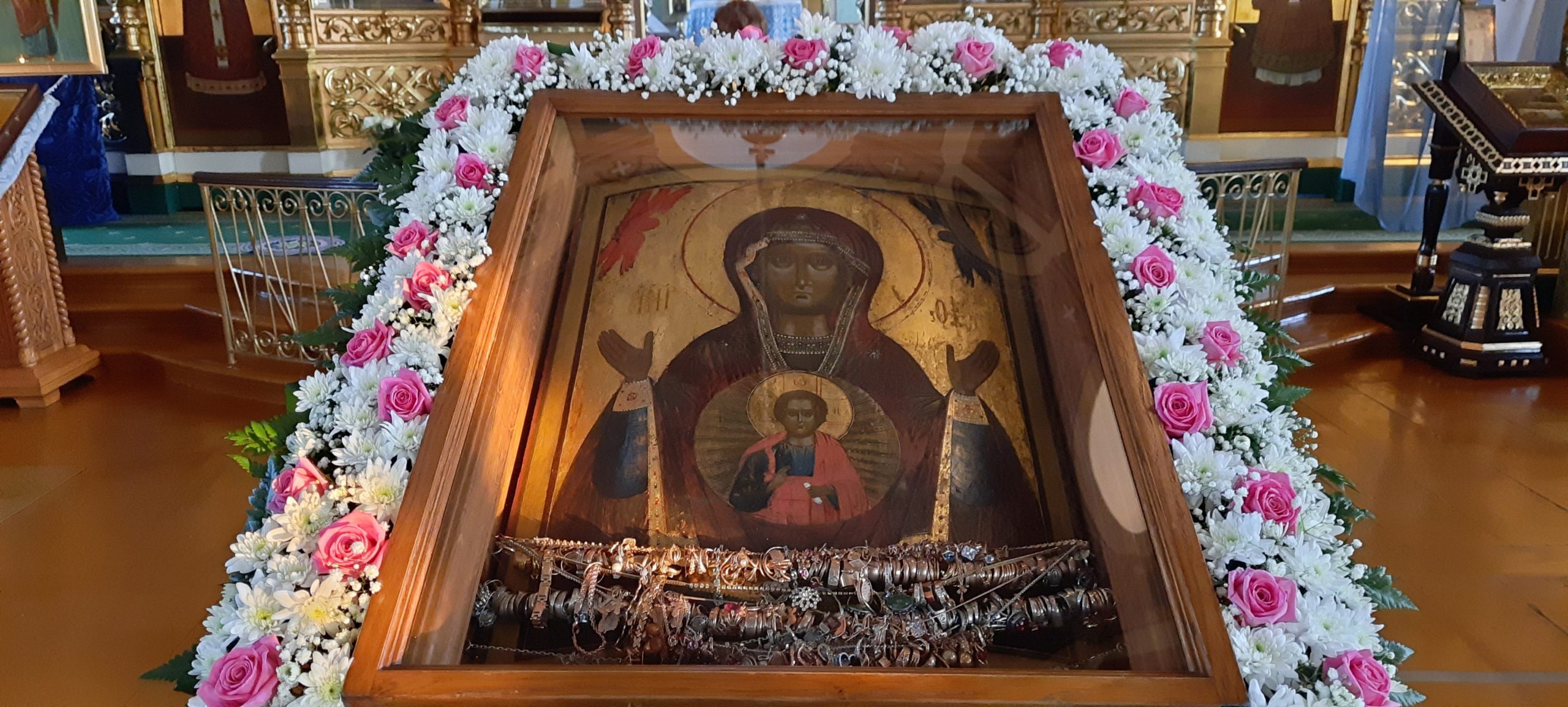 Вскоре усердием благочестивых людей на месте явления иконы был выстроен деревянный храм в честь Пресвятой Богородицы, в котором была поставлена найденная икона, а в 1818 году был отстроен каменный храм. Икона, написанная на железном листе, украшена серебряно-позолоченной ризой и драгоценными камеями.