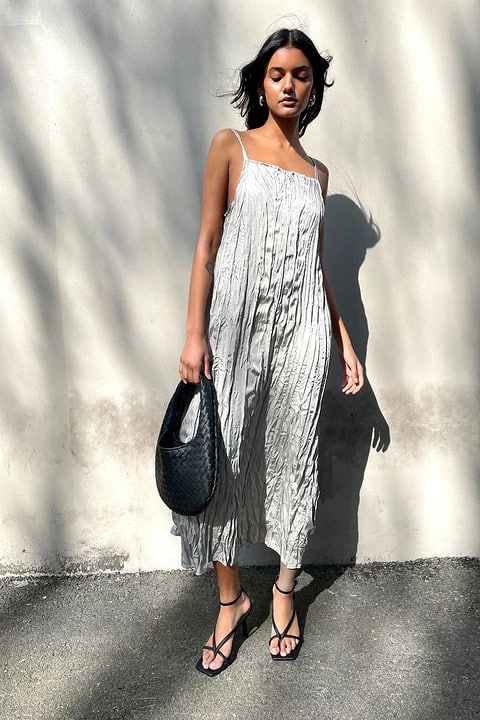 Платье-колонна из жатого шелка + босоножки + клатч.