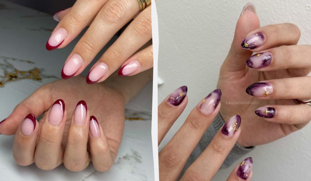 Сливовые вихри. Позвольте вашему маникюру нарушить правила. Волнистые узоры более светлого оттенка на темном фоне выглядят как проявление творческой энергии. Добавьте каплю перламутра — и шедевр готов.