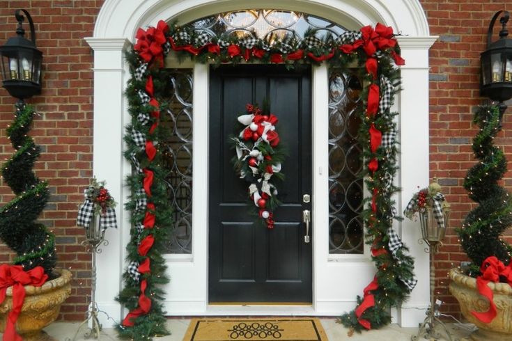 В частном доме можно украсить не только саму дверь, но и пространство вокруг нее. По обе стороны входа красиво смотрятся растения в кадках — мини-елочки, пихты или искусственная пуансеттия. Если используешь живые растения, убедись, что они переносят холод.