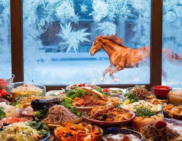 Чем разнообразнее и щедрее угощения, тем изобильнее будет год. На столе приветствуются мясные и рыбные блюда, салаты, выпечка, фрукты и сладости. Символ праздника — торт — завершает атмосферу достатка и радости.