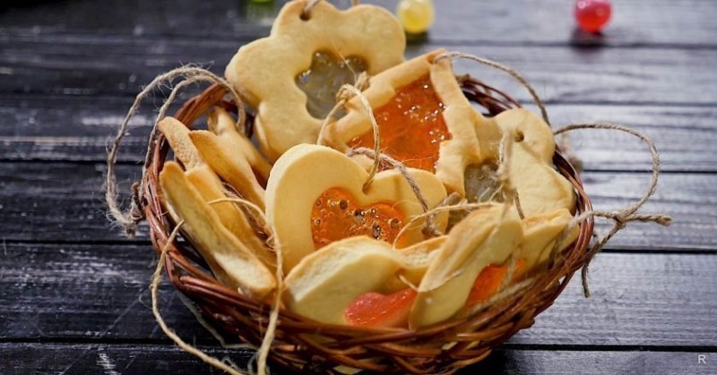 Чем только не украшают новогоднюю елку. На нее вешают не только игрушки, но и различные конфеты, зефир, палочки корицы. Оригинально буде выглядеть на дереве и печенье «Витраж». Такое название оно получило благодаря прозрачной карамельной сердцевине, которую можно сделать с самых простых разноцветных леденцов.