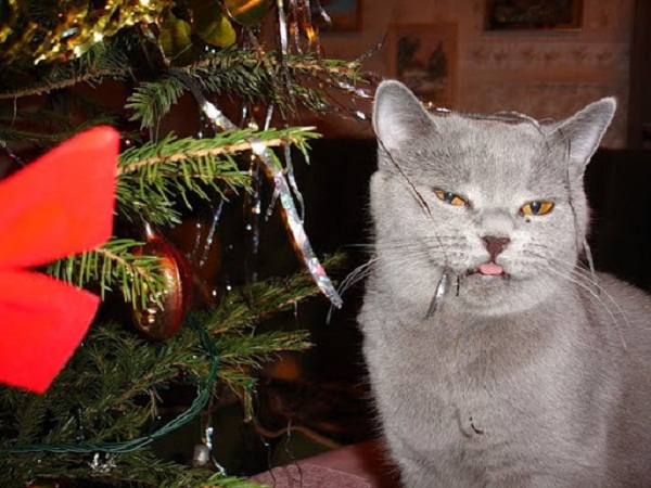 На кошку может негативно подействовать. Самостоятельно также нельзя вытягивать новогодние украшения, так как они могут порезать желудок кошки.