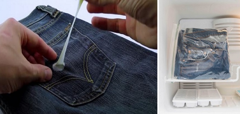 Чтобы убрать с джинсов прилипшую жвачку, их нужно заморозить, а жвачку потом аккуратно отскоблить ножом.