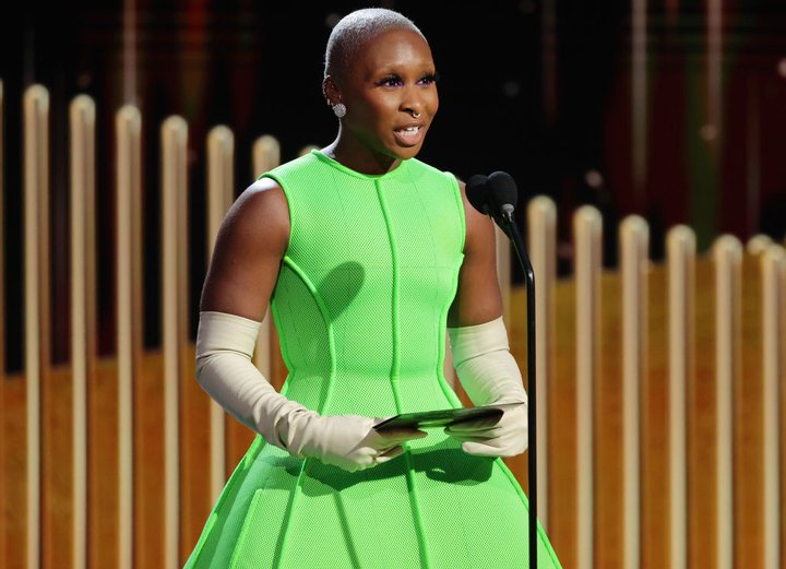 Немало обсуждений вызвал наряд и Синтии. Ведь она появилась в длинном и пышном платье неонового цвета. Некоторые критики сравнили ее с принцессой из мультиков Disney. Однако больше всего обсуждений вызвали завышенные перчатки белого цвета. На ноги Ериво надела туфли с большим каблуком и платформой спереди.